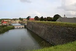 The moat, the drawbridge, the western walls and the bastion of the Mill