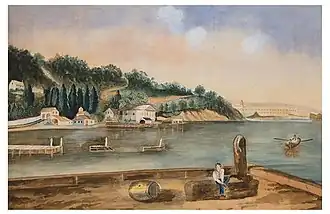 In the early 1780s, several acres of the landscape around the tavern were reshaped by Samuel Vaughan, a London merchant who owned plantations in Jamaica and who possessed a zeal for designing gardens. Vaughan planted trees and other plants and added winding walkways through groves and arbors and water features. "The place was a veritable fairy scene, with bowers, grottoes, waterfalls, bridges, islands, and a most attractive Inn, with tables set upon the greensward," according to a 1922 history journal.[3] In effect, Vaughan created "American's first public pleasure park." The gardens turned the tavern from merely a travelers' waypoint into a resort spot, easily reached from the city for meals and day trips.[4]