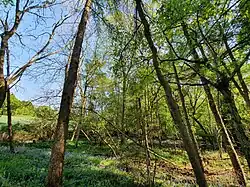 The woodland has a convex outline, being primarily inaccessible at all edges except for an unmaintained opening on the south-western edge, in which a footbridge had existed. The interior is very irregular, defined by dense thickets and dead wood. An unnamed stream cuts through the center of the copse.