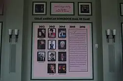 Since 2011, the Songbook Foundation has presented the following exhibits: "G.I. Jive: The Music and Entertainers of World War II" (2011), "The Great American Songbook" (2012),[6] "Blast from the Past: Roaring Hot '20s Jazz" (2013),[7] "A Change Is Gonna Come: 1960s Broadway Musicals" (2014),[8] "Gus Kahn: The Man Behind the Music" (2015),[9] "The Great Indiana Songbook: Two Centuries of Hoosier Music" (2016),[10] "Ella Sings the Songbook" (2017),[11] "The Unsinkable Meredith Willson" (2018), "The Andrews Sisters: Queens of the Jukebox" (2019)[12] "Of Thee I Sing: Politics on Stage" (2019–2021).[13] The current display, "From the Jazz Age to Streaming: The Soundtrack of the 20s-20s," was first installed in 2021.[14] Additionally, the Songbook Foundation lends traveling exhibits and provides adapted online exhibits and Songbook Library & Archives collections highlights.[15]