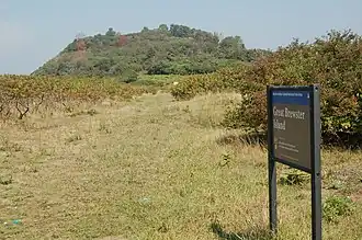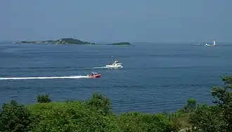 Great Brewster Island is one of the outer islands in the Boston Harbor Islands National Recreation Area, situated some 9 miles (14 km) offshore of downtown Boston. The island has a permanent size of 18 acres (73,000 m2), plus an intertidal zone of a further 49 acres (200,000 m2). Unlike the other outer islands, which are low-lying outcroppings of bedrock, Great Brewster is a drumlin which reaches a height of over 100 feet (30 m) above sea level. It has vegetation cover consisting of Eastern white pine, Asparagus, Apple Trees, Pear Trees, Sumac, Beach Roses, Grasses and Common Reeds, together with a large Gull colony. The birds are aggressive during nesting season and access by humans, which is by private boat only, is discouraged during that time.[1]