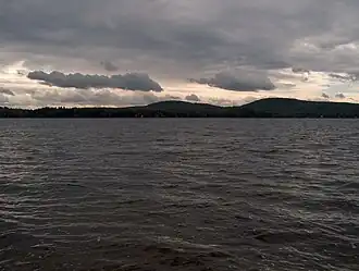Great East Lake is an 1,825-acre (7.4 km2)[2] water body located in Carroll County, New Hampshire, and York County, Maine, in the United States. The lake is shared by the towns of Wakefield, New Hampshire, and Acton, Maine, with 45% of its surface area in Acton and 55% in Wakefield.[4] The lake is the farthest upstream of the five headwater lakes of the Salmon Falls River, a tributary of the Piscataqua River. Water from Great East Lake flows out its dam and through the 800-foot (240 m) Newichawannock Canal into Horn Pond, then into the Salmon Falls River below Horn Pond.