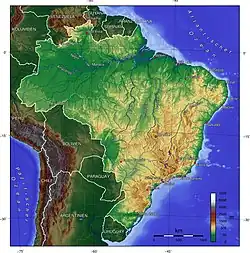 The escarpment rises steeply from the coastal plain to as much as 9,000 feet (2,700 m) in height.[2] The top of the escarpment forms a drainage divide between the interior and the coastal plains.[3] Apart from the São Francisco River, most streams flow into the central basin rather than to the coast.[2] The escarpment defines the eastern edge of the Serra do Mar and other mountain ranges.[4][5]