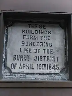 On the building at 411 Smithfield Street, between Fourth Avenue and Forbes Avenue, is a stone historical marker saying "These buildings form the bordering line of the burnt district of April 10th, 1845."