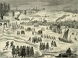 The Great Frost of 1683–1684 was a frost across England, reported as the worst in its history.[1] During the Frost, the surface of the River Thames was reported as frozen to the depth of one foot (30 cm).[2] The Great Frost enabled one of the River Thames frost fairs.[1] Entertainment on the frozen Thames as result of the Great Frost began the career of Chipperfield's Circus.[2] A Great Frost Fair was also held in Leeds, when the River Aire froze solid for a month allowing a fair with an ox-roast and sports to take place, as described by Ralph Thoresby.[3]