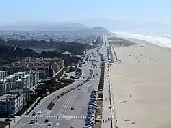 The Great Highway, San Francisco, California, looking south from Sutro Heights. The straight section in the distance was permanently closed to traffic in 2025. | |