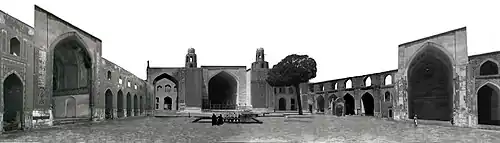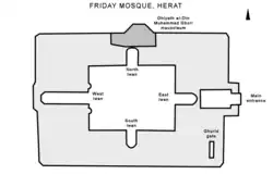 The Ghurids built the entire original mosque using brick.[4] The layout was a typical 4-iwan plan with an interior courtyard and a water basin (now disappeared). The qibla orientation towards the west was adhered to, although this deviates from the correct direction to Mecca by about 20°. The main iwan was covered by vaults. It formed an axial cross with the other three iwans on each side of the courtyard. These three iwans were intended as meeting and teaching places for smaller audiences.[2][5]
