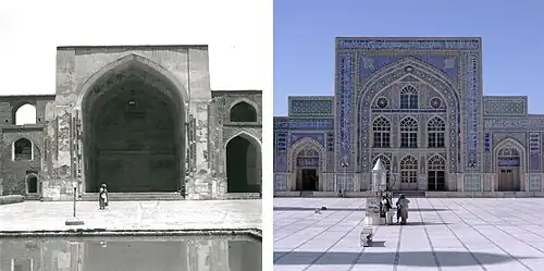 The follow-up was a more complete reconstruction from 1951 to 1973 involving structural changes.[5] The square dome of the Ghiyath al-Din mausoleum of Ghurid times was largely destroyed. It was replaced by an octagonal construction and integrated in the northern front. The wall to the east was also changed into an iwan with minarets on both sides. Also, the maqsura iwan, an enclosure reserved for the ruler, was made higher. The minarets next to it were heightened to 35 metres (115 ft) tall. Its porch was renewed. In addition, ten new minarets were added.[2][13] The facades in the courtyard were tiled with traditional mosaics in seven different colors. The floor was paved with light brown baked bricks. Due to all these works, not much of the original Ghuridic plasterwork or Timurid decoration was visible. The mosque's madrassa was moved to the northeast and given its own entrance. The last significant change was the creation of a park in front of the mosque.[2][5]