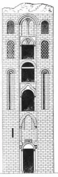 The minaret's decoration is carefully organized into three vertical registers.[3][19] At the forefront, a rectangular plaque adorned with palmettes and scrolls embellishes the entrance. In the middle, a series of blind or open arches, varying in shape from pointed to round, are superimposed.[8] Flanking this central register are blind niches, occasionally embellished with shell motifs, housing mosaic ceramic or cross designs remodeled in stucco at the rear, arranged symmetrically. Early researchers discerned in certain elements of the decoration a connection with ancient and Byzantine motifs.[6] The central register showcases, above the entrance door, a carved stone table, a partially preserved quintilobate arch, three stacked bays, and a recess with three semicircular arches. As for the lateral registers, they mirror each other's decoration, featuring, from bottom to top, a niche with a semi-cylindrical base crowned by a shell-shaped vault, and two niches with flat bases.[8][22]