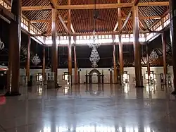 Surakarta Great Mosque is located within a 19,180 sqm complex surrounded by a solid wall. The design of the Great Mosque of Surakarta follows a conservative Javanese architecture principle. It basically consists of two buildings: the main prayer hall and the front hall (serambi). The main prayer hall has seven doors connecting it with the serambi. Four main posts (Javanese soko guru) supported the roof of the main prayer hall. This roof is a pyramidal tajug-styled roof, a type of roof traditionally reserved for sacred buildings in Javanese architectural principle. The roof is three-tiered, topped with a mustaka (rooftop ornament).[1] As a royal mosque, there is a maksura to the left of the mihrab. A maksura is a place for the ruler of the kraton to perform prayer. In case of the Great Mosque of Surakarta, the maksura has a small hip roof.