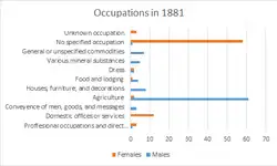 In 1881 just over 60 men were involved with agriculture, which was the largest occupation at the time. Many of the workers were employed as an agricultural labourer, farm servant or cottager. The next most popular job for men was work in houses, furniture or decorations, with 8 male workers employed in this profession. Most of the women during 1881 were not in specific occupations, although 12 women were employed in domestic offices or services, with the next most popular job for females being work in professional occupations and their direct subordinates, with 3 women and one male employed.[14] Comparatively, in 2011, of the 402 residents employed in Great Moulton only ten males were working in the agricultural sector, and 48 men were employed in construction, which had the highest number of male employees.[15] Over 50 women were employed in administrative and secretarial occupations, and 16 women were employed as managers, directors and senior officials.[16] Overall the most common job is work in wholesale and retail trade; repair of motor vehicles and motor cycles which had 65 employees.[17]