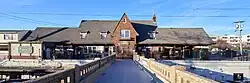 Though Great Neck station served as a terminal station for much of the 19th century, it was never intended to stay this way.[4] An attempt to extend the line east from the station toward Roslyn failed in 1882. Thirteen years later, wealthy Port Washington residents persuaded the LIRR to bring the terminus to their hometown. This required the construction of the Manhasset Viaduct over the marshes at the southern end of Manhasset Bay, which was authorized by an LIRR subsidiary called the Great Neck and Port Washington Railroad.[4][5] On June 23, 1898, the first LIRR train passed through Great Neck to cross the Manhasset Viaduct, Long Island's highest railroad bridge, to extend the line through Manhasset, Plandome and Port Washington. In 1924, the station was closed; it was reopened at its current location on February 26, 1925. A grade crossing elimination project then brought the tracks below ground by June 8, 1934.[4][6] Elevators are on both sides.[6] The wall along the southeastern platform has an aluminum sculpture by artist David Saunders that was installed in 2001.