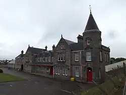 Plans to reach fishing ports at Macduff and Banff from Inverurie were proposed when the Great North was first suggested, but failed because of the lack of financial support. A different route, from Milton Inveramsay, allowed for a shorter route with easier gradients. Unable to raise sufficient money for a line to the coast, a shorter 18-mile (29 km) line to Turriff was built. The Great North invested in the railway, and directors sat on the board of the Junction Railway. The new line, together with a junction station at Inveramsay, opened on 5 September 1857.[30] A separate company, the Banff, Macduff and Turriff Extension Railway, built an extension to a station called Banff and Macduff. The line was operated by the Great North from 4 June 1860,[31] and served an inconvenient terminus high on a hill 34 mile (1.2 km) from Macduff and 14 mile (400 m) from the bridge across the River Deveron to Banff. Four trains a day ran from Inveramsay, taking between 1 hour 30 minutes and 1 hour 50 minutes, with connections with services to Aberdeen.[32] Both railways were absorbed by the Great North of Scotland Railway on 1 August 1866,[27] and the line was extended 12 mile (800 m) to a new Macduff station in 1872.[33]