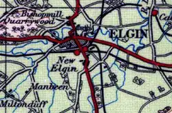 A 16-mile (26 km) double-track railway had been proposed from Lossiemouth to Craigellachie in 1841 and necessary permissions granted in the Morayshire Railway Act 1846 (9 & 10 Vict. c. clxxviii), the route having changed to take advantage of the proposed Great North of Scotland Railway between Elgin and Orton. The financial situation delayed construction, but work eventually started on the section from Lossiemouth to Elgin in 1851. The 5+12-mile (8.9 km) line opened on 10 August 1852 with a special train from Elgin to festivities in Lossiemouth. Public services started the next day with five services a day, each taking 15 minutes with two request stops.[47] First and second class accommodation was provided at 1+12d and 1d a mile. However, it was the Inverness and Aberdeen Junction Railway (IAJR) who was to build the line from Elgin to Orton; permission to build a branch from this line to Rothes was granted to the Morayshire in the Morayshire Railway (Extension) Act 1856 (19 & 20 Vict. c. lxxxvi) on 14 July 1856.[48] The IAJR built its own station at Elgin, linked to the Morayshire's station by a junction to the east. The IAJR opened on 18 August 1858 and the Morayshire Railway started running services on 23 August.[49]