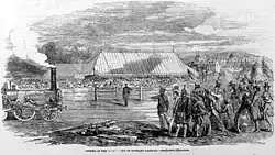 The wooden station building at Waterloo was a 12-mile (800 m) from the Aberdeen and Deeside's Guild Street station[54] and passengers were conveyed between the termini by omnibus, paid for in the through fare and with forty five minutes being allowed for the transfer. The Great North refused to hold its trains to connect with those arriving at Guild Street[55] and insisted that tickets were purchased at least five minutes before the train was due to depart.[56] The mail train would be held until the Post Office van had arrived and the mail was on board, but the station locked at the advertised departure time to prevent connecting passengers further delaying the train.[57] This inconvenienced passengers, as was pointed out to the general manager during a parliamentary committee meeting by a member of parliament who had missed a connection, although his family and luggage had been sent on.[58] The Great North promoted onward traffic by sea[59] and approached the Aberdeen Steam Navigation Company to see if rates could be reduced for through traffic[60] and through ticketing by rail was not available until 1859, when the Great North joined the Railway Clearing House.[59]