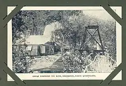 The Great Northern lode was on the eastern side of the Wild River and they traced the three feet wide lode for two miles up the ridges. They located two to three hundred weights of rich tin and, local legend has it, they smelted it crudely on site in a tree stump using their felt hats as bellows. Jack and Newell communicated their find to John Moffat in Stanthorpe who agreed to invest in a battery and smelter in the newly named Herberton area. By August 1880 there were 70 miners at work at Herberton.[1]
