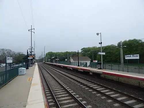 Great River is a railroad station on the Montauk Branch of the Long Island Rail Road, at Connetquot Avenue and Hawthorne Avenue in East Islip, New York. The station opened in 1897.