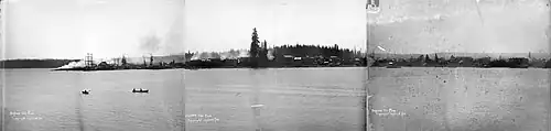 At the Burrard Inlet shore, some residents were able to flee out into the inlet on floats and vessels.[1] At least two hundred people found refuge on the Robert Kerr, "the ship that saved Vancouver", a 58-metre (190 ft) wooden ship at anchor close to the Burrard Inlet shore at the time.[8] The local Squamish Nation provided help to the survivors who were floundering in the water.[9] They paddled over and canoed people to safety.[9] The men of the Vancouver Volunteer Hose Company No.1 went to Scoullar's General Store to remove a supply of explosives, which were taken to the Hastings Mill at the opposite end of town.[1] The city clerk Thomas McGuian saved the city records detailing the city's short history by entrusting them to a stranger.[1]