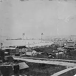 European settlement in the Vancouver area began in 1862 after Captain George Henry Richard's 1859 discovery of coal in the Burrard Inlet.[3] The settlement of Granville (later Vancouver) was formed in the mid-1860s between two Burrard Inlet sawmills.[3] It began as shops and hotels providing service to the workers of the mills and later their families.[3] The two sawmills were Moodyville (originally Moody's Mill), opened 1863, on the Burrard Inlet north shore and Hastings Mill (originally Stamps Mill), opened 1867, on the Inlet's south shore.[3] The two mills were the main employers in Granville.[3] In the early 1880s, they employed between 150 and 200 workers, not including loggers and longshoremen.[3] The exact numbers are unknown as many of the workers were transient unmarried men, who worked at a mill for only a few weeks at a time before moving on.[3] To reach Granville required either a nine-mile journey through dense forest from the nearby larger town of New Westminster or a thirty-mile journey via the Fraser River from Fort Langley, the capital of British Columbia at the time.[3]