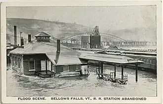 ![]() The train station in Bellows Falls, Vermont depicted on a postcard after the Great Flood of 1927 | |