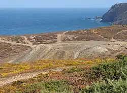 Great Wheal Charlotte, also known as Wheal Charlotte, is an abandoned copper and tin mine lying between St Agnes and Porthtowan in Cornwall, England. All that is left of the mine now is the wall and door arch of an engine house and an adjacent fenced-off mine shaft. The surviving wall is surrounded by rock debris and the extensive remains of spoil tips, mostly of bare rock fragments crisscrossed by paths that link the South West Coast Path with surrounding land owned by the National Trust.[1] Predominantly a copper producer,[2] in its heyday, in the 1830s, the mine extracted ore containing 7.25% copper. It may have partially closed around 1840.[3] However, ore production was high in this year, and records of output extend at least to 1856, and possibly to 1863.[4]