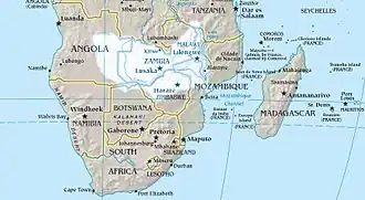 Statesman Jan Smuts repeatedly had called for South African expansion since 1895, envisioning a future South African border along the river Zambesi or even the equator.[2] German South-West Africa, Southern Rhodesia, and at least the southern parts of Portuguese Mozambique (especially the port of Lourenço Marques in the Delagoa Bay) along with the High Commission Territories (Basutoland, Bechuanaland and Eswatini, the last one having been a Transvaal protectorate from 1890–99) were to be included in this state, with Pretoria now being its geographical capital.[2] Although the initial objective of Smuts' expansion plan was the Zambesi, he took great geopolitical interest in the East Africa Protectorate and Tanganyika. Smuts was impressed with the British colonists of the White Highlands and believed that the area could be transformed into a "great European state or system of states" in the near future, eventually leading to a "chain of white states which will in the end become one from the Union to Kenya".[3] Smuts believed this expansion would finally lead South Africa to become "one of the greatest future Dominions of the Empire", the equal of Australia and Canada.[3]