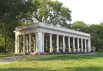 The Grecian Shelter, designated a Croquet Shelter on the original plans of Prospect Park, is also referred to as the Prospect Park Peristyle or Peristyle.[2] The building, a peristyle with Corinthian columns, is situated near the southern edge of Prospect Park in Brooklyn, New York. Constructed by McKim, Mead and White in 1905, this peristyle was built on the site of the 1860s-era Promenade Drive Shelter along the southwest shore of the Prospect Park Lake.[3] The Prospect Park Peristyle is designed in the Renaissance architectural style. It consists of a raised platform located two steps above ground level; the platform is covered by a rectangular colonnade with 28 Corinthian marble columns, each with square piers. An entablature of terracotta runs atop the structure.[3][4] The building was constructed as a temporary refuge from rain and sun.[2]