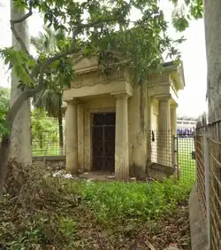 On the walls within are fixed nine inscriptions carved on black stones, and another lies broken on the floor stone is of Sultana Alexander, who died on 6 February 1800. A stone bears the names of the three Ellias brothers. John Demetrius Ellias (d. 1836), one of the brothers, was killed by a tiger while he was hunting at Mirpur, 25 miles off what is now the Dhaka University campus. Basil Demetrius, the Greek clerk at St Thomas' Church, was also buried at the place. Besides being a church clerk, he was also a writing master and a teacher at the Dhaka College for 10 years. He died in 1860.