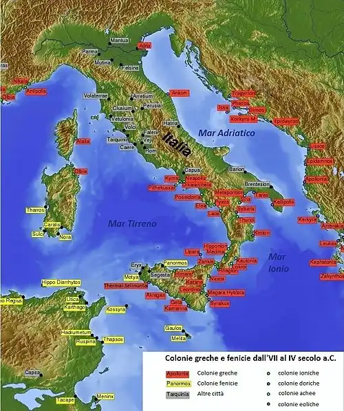 The region of Magna Graecia included originally Greek cities such as Cumae, Herakleia, Kaulonia, Kroton, Lokroi, Neapolis, Metapontum, Sybaris, Taras, Thurii and Rhegion.[2][7][8][9]