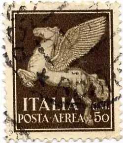 The figure of Pegasus appears frequently on stamps, particularly on those used for air mail.[15] In 1906, Greece issued a series of stamps featuring stories from the life of Hercules.[16] Australia commemorated the laying of an underwater cable linking the Australian mainland to the island of Tasmania with a stamp featuring an image of Amphitrite.[17]
