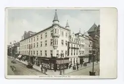 Green's Hotel was a historic hotel in Philadelphia, Pennsylvania. The hotel was organized in 1883 by incorporating several notable Philadelphia buildings at 731 Chestnut Street at Eighth Street - Thomas H. Green's restaurant (opened in 1866), the Edward Shippen house, Philemon Dickenson house, and the Union Building.[1] [2] A notable feature of the hotel was its bar which had a ceiling with an Arctic effect, complete with snowy vistas and icicles.[3] The bar was replaced with a soda fountain in 1922.[4] The hotel, which grew to become a 320 room hotel, was demolished in 1934 and replaced by a parking lot.[5]