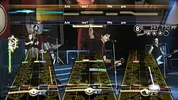 From a musical perspective of reviewers, the limited range of Green Day compared to the Beatles creates a much less diverse experience compared to the previous game, diminishing the interest level for those not familiar with Green Day's music. Many stated that one's personal enjoyment of the game would strictly depend on their preference for Green Day.[33][34] While the inclusion of full albums was well received, some reviewers wished for more songs to be included in the game, particularly from their mid-career albums.[31] Minkley considered that by skipping over these albums, "the experience is robbed of any real insight into Green Day's evolution" between Dookie and American Idiot.[28] However, despite the song selections, reviewers found Green Day's songs to be better suited to Rock Band than The Beatles', in part to how enjoyable it was to play all the songs regardless of the instrument used, and without having to chart atypical instruments, such as piano or cello, to the instrument parts.[28][31] Reviewers found the guitar portions to be challenging but not impossible due to the endurance of the chord-heavy part.[29] DeVries found the vocal harmonies mechanics to be better suited to Green Day, as with the lyrical trade-offs in many of the songs, "it's less about trying to sing at a slightly higher pitch and more about just having fun".[31] Critics also commented the use of censored radio edits to maintain the game's Teen rating, and felt this weakened the music included in the game.[31][33] The ability to export the game's songs to other Rock Band was well received.[29][27][32][34] However, Lou Kesten of the Associated Press noted that the added cost to export the game, as well as the cost of the additional six tracks available as downloadable content, made it feel that "MTV is nickel-and-diming its loyal audience".[35]