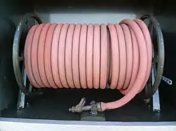 The Sigmund F.N.5 main pump has a capacity of 1,000 imp gal/min (4,500 L/min) per minute (900 imp gal/min (4,100 L/min) on 4×4 versions). Normal fire hoses could be used either from the main pump, which had four outlets, or from normal fire hydrants for which an assortment of connecting branches were carried. In addition, the machines carried a small Coventry Climax 350 imp gal/min (1,600 L/min) pump, with its own petrol engine, which could also draw water from a river or other source, again feeding normal fire hoses, and which provided a separate and self-contained fire fighting capability. A 400 imp gal (1,800 L) water tank (300 imp gal or 1,400 L on 4×4) was installed, which fed small diameter hoses on each side of the vehicle to give an immediate "first aid" capacity to fight a fire while the main hoses were connected and brought into use. A stirrup pump was also carried, together with a full range of other suitable tools and equipment.