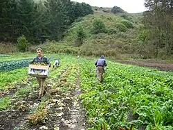 Green Gulch operates, in addition to the Zen center, a 7 or 8-acre (32,000 m2) organic vegetable farm and a 1 to 1.5-acre (6,100 m2) fruit, herb and flower garden.[11] The fruit, herb and flower garden is, "arranged in a series of 'rooms' in the formal English style. In the bowl of the valley is the core of the gardens: an herbal circle of shrubs, roses and perennials, enclosed by a yew hedge with rose arbors and paths out to the larger garden. At the center of the circle is a Japanese snowbell (Styrax japonica) encircled by herbs and lichen-covered rocks."[1] The garden is open daily from 9:00 a.m. to 4:00 p.m., though groups of more than six should call before arriving. Volunteers, also, are welcome to help cultivate the garden on Tuesdays from 9:00 a.m. to 12:00 p.m. (again, call in advance).[12] The vegetable farm sustains the community living at Green Gulch and also sells its produce at various local farmers markets and to whole foods stores.[1][13] Green Gulch Farm also provides organic produce from the vegetable farm around the year to Greens Restaurant in San Francisco, a vegetarian restaurant where Annie Somerville is executive chef.[14]