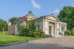 The Hayden family mausoleum is the cemetery's largest. Designed by local architect Frank L. Packard,[46] it was completed for banker Charles H. Hayden in early 1905.[47] Built at a cost of about $80,000 to $100,000 ($2,800,000 to $3,500,000 in 2024 dollars), the Neoclassical style tomb had a granite foundation, interior and exterior walls of white Vermont marble, and two Ionic columns on each side of the main entrance. The structure is 45 feet (14 m) wide, 55 feet (17 m) deep, and has a 45-foot (14 m) high dome. The interior is octagonal, and features two columns of marble with a hue like alabaster in each corner. The tomb originally contained eight marble sarcophagi, carved in Italy. The main doors were of bronze. Hayden wanted the construction of the mausoleum to be a surprise for his family, so Packard refused to tell the press or cemetery officials who commissioned the work until it was completed.[47]