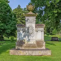 At the time, the cemetery was located 2.5 miles (4.0 km) west of the nascent village of Columbus.[9] The first burial at Green Lawn Cemetery was that of a child, Leonora Perry, on July 7, 1849.[11] The second, and first adult, was Dr. B. F. Gard on July 12.[18] The first headstone or other monument in the cemetery was erected the second week of October 1849 by William G. Deshler. It was for his wife, Olive, who had died at the age of 19. The monument consisted of an upright stone slab depicting a rose branch. The bloom itself was carved on the plinth on which the slab stood, and was inscribed "Olive, wife of William G. Deshler, age 19".[19] After Green Lawn opened, most of the families with graves at Franklinton Cemetery moved their ancestral remains to Green Lawn.[1][e] Franklinton Cemetery quickly fell out of favor as a place to be buried.[8] Those buried at North Graveyard also disinterred loved ones' remains and moved them to Green Lawn. By 1869, about half of those buried at North Graveyard had been reinterred at Green Lawn.[19]