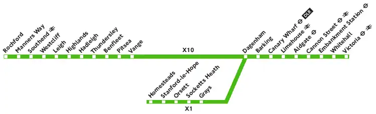 | Via | Southend Benfleet Dagenham | ||||||||||||||||||||||||||||||||||||||||||||||||||||||||||||||||||||||||||||||||||||||||||||||||||||||||||||||||||||||||||||||||||||||||||||||||||||||||||||||||||||||||||||||||||||||||||||||||||||||||||||||||||