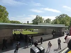 The station was busy and unsuccessful attempts to control crowds with gates at platform level were made in 1918. In the 1930s, the station was included amongst those modernised in conjunction with the northern and western extensions of the Piccadilly line. A new sub-surface ticket hall was opened on 18 September 1933 with a pair of Otis escalators provided to replace the lifts.[30] The new ticket hall was accessed from subway entrances in Piccadilly. On the north side, an entrance was provided in Devonshire House on the corner with Stratton Street; on the south side an entrance was constructed on a piece of land taken from the park.[27] The shelter for the southern entrance was designed by Charles Holden.[31][e] The original station building, the lifts and the redundant below-ground passages were closed and the station was renamed Green Park. Part of the ground floor was used as a tea shop until the 1960s.[27] In 1955, a third escalator was added to help deal with increased passenger numbers.[33]