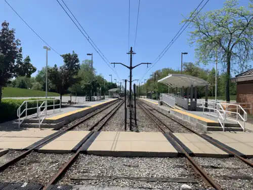 As part of the rebuild of the entire Green Line and Blue Lines, Green Road station was rebuilt in 1980. With the elimination of PCC cars and complete conversion to new LRV cars shortly thereafter, the loop at the end of the Green Line was no longer needed, but it remains and is the only loop in the light rail system.