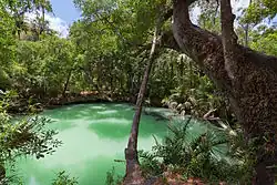 Green Springs Park is located near the north shore of Lake Monroe, approximately 2.5 miles (4.0 km) east of Interstate 4 in Enterprise, Florida. The spring supplies fresh water to Lake Monroe from the Florida aquifer. The spring basin is about 70 feet (21 m) wide[3] by about 76 feet (23 m) deep.[1][4] The water varies in color depending on the time of year, changing from green in the spring to more of a turquoise color in summer, back to green in the fall and finally to jade in the winter.[5]