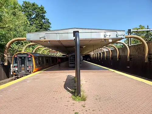 Green Street station (signed as Green) is a rapid transit station in Boston, Massachusetts. It serves the MBTA's Orange Line and is located in the southern part of the Jamaica Plain neighborhood. Green Street is the least-used station on the Orange Line, averaging 3,055 weekday boardings in FY 2019.[2] Like all Orange Line stations, it is fully accessible.