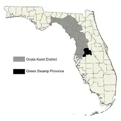 The Green Swamp is designated as a geomorphological province by the Florida Geological Survey. The province includes southeastern Hernando, eastern Pasco, southern Sumter, southwestern Lake, northern Polk, and northeastern Hillsborough counties. It lies between the southern end of the Brooksville Ridge and the middle of the Lake Wales Ridge Complex. It borders the Tsala Apopka Plain to the north, the Land O'Lakes Karst Plain to the southwest, and the Hardee Upland to the south. The province has some features of a karst landscape, but the features are not as strongly developed as in some neighboring geomorphological provinces. The province is flat with cypress swamps and pine flatwoods. Low ridges occur in the eastern part of the province close to the foot of the Lake Wales Ridge Complex. Scattered dunes occur elsewhere in the province. There are nearly-circular cypress swamps throughout the province in shallow sinkholes surrounded by pine flatwoods. One prominent karst feature is Dobes Hole on the Withlacoochee River. It acts as a swallet when the river is high, diverting some of the river flow underground, and as a spring when the water table is high, adding to the river's flow. There are also some siphons in the Withlacoochee River in places where the bottom of the river channel is exposed bedrock (part of the river's flow enters an underground channel that later rejoins the river).[15]