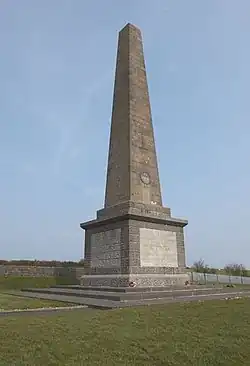 The Knockagh Monument, a basalt obelisk erected as a memorial to the citizens of County Antrim who died during World War I and World War II. It sits at the summit of Carn Hill known locally as "Knockagh Hill", overlooking the village and is the most notable landmark of the surrounding area.[3]