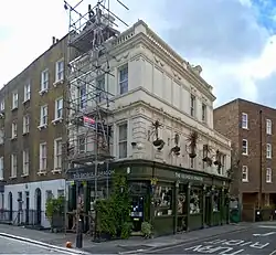 On the south side are the new houses built between the pub and Great Titchfield Street that controversially replaced the former home of the Flaxmans,[1] and on the western end between Great Titchfield and Bolsover Street is the rear of the Holiday Inn London – Regent's Park hotel (originally the Regent Crest Hotel built in 1972[10]) in Carburton Street.[11]