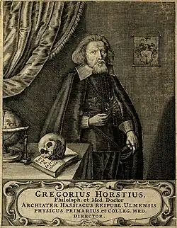 Horst was born in Torgau to architect Georg Horst (1534–1584) and Anna née Bornitius. A half-brother was Jakob Müller (1594–1637) who also became a professor of medicine at Giessen. Horst studied at the University of Helmstedt (1597) and Wittenberg (1600). He travelled in Switzerland and Austria and received his medical degree in 1606 at Basel. He taught medicine at the University of Wittenberg and then to Giessen in 1608. In 1609 he was appointed personal physician to Landgrave Ludwig V of Hesse-Darmstadt. He was involved in the drafting of the “Leges et Statuta Collegii Medici” (1609) of Giessen.[1] He married Hedwig Stamm, daughter of a fellow-professor, in 1615. They had six children including a namesake Gregor Horst (1626–1661) who became an anatomist and collaborated with Conrad Gesner. Another son, Johann Daniel Horst (1616–1685), became a professor of medicine in Marburg. He served as Rector of the university of Giessen in 1612 and 1616 but left in 1622 due to troubles from the Thirty Years' War. He became a city physician at Ulm where he died in 1636 from gout.[2]
