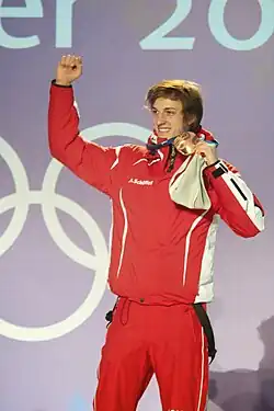 Gregor Schlierenzauer was born on 7 January 1990 in Innsbruck, Tyrol, to Paul and Angelika Schlierenzauer.[5] The second of three children, he has an older sister, Gloria, and a younger brother, Lukas. His uncle is Markus Prock, the winner of three Winter Olympic medals in men's luge, who settled him a contract with Fischer Skis in 2001 and a few years later with Red Bull. Schlierenzauer has been deaf in his left ear since birth.[5] He is also the cousin of luger Hannah Prock.[6]
