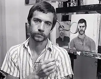 ![]() Gillespie with self-portrait in his Rome studio, c. 1969 | |