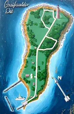 By 1850 three families that let the island from the city permanently settled on the island and lived from fishing as well as farming. Between 1853 and 1855 the architect Hermann Kirchhoff constructed a lighthouse on the island.[4] In 1865 the island had 41 residents. Between 1873 and 1877 a fishing harbor was built on the island which also assisted fishermen nearby that were in maritime emergency.[5] In 1883 the island was sold to the Prussian state by Greifswald as the city could not longer afford to keep the lighthouse and the emergency rescue operations running. The island was used by tourists and became a popular spot for vacationing, and especially swimming, between 1877 and 1937. Tourists were brought to and from the island with a steam-powered ferry that serviced the location multiple times a day.
