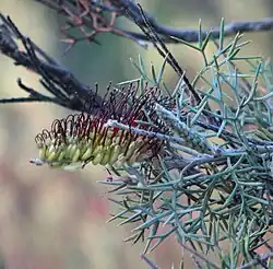 Grevillea armigera, also known as prickly toothbrushes or thorny grevillea,[3] is a species of flowering plant in the family Proteaceae and is endemic to the south-west of Western Australia. It is an erect to spreading shrub with deeply-lobed leaves, the lobes linear and sharply pointed, and grey, green or pale yellow flowers with black to maroon styles.