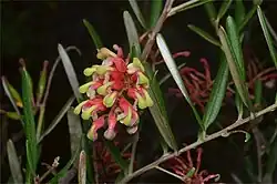 Grevillea aspera, commonly known as the rough grevillea,[4] is a species of flowering plant in the family Proteaceae and is endemic to Australia, occurring mainly in South Australia. It is low, spreading to erect shrub with oblong to egg-shaped leaves with the narrower end towards the base, and pinkish to red and cream-coloured, green, yellow or white flowers.